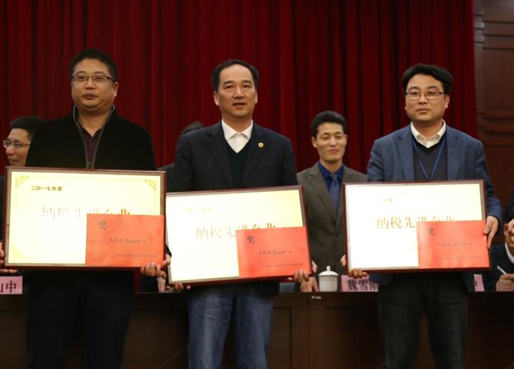 閏土新材料公司董事長(zhǎng)周杰文、迪邦公司總經(jīng)理陳曉棟分別領(lǐng)取“納稅先進(jìn)企業(yè)”獎(jiǎng)項(xiàng)